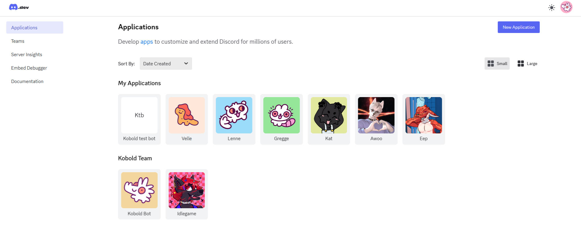 The first step to making a proxy bot is making a discord app! To begin, go to the Discord Developer Portal (link). It should look like this without any applications. Bookmark this page to come back to to edit the looks of your proxy bot. From here, click on "New Application" in the top right.