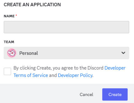 You should be prompted with a box like this. Enter the name of the bot you would like, however this can be changed later. Personal team, and then agree to the terms of service and hit create. You might be prompted with a captcha.