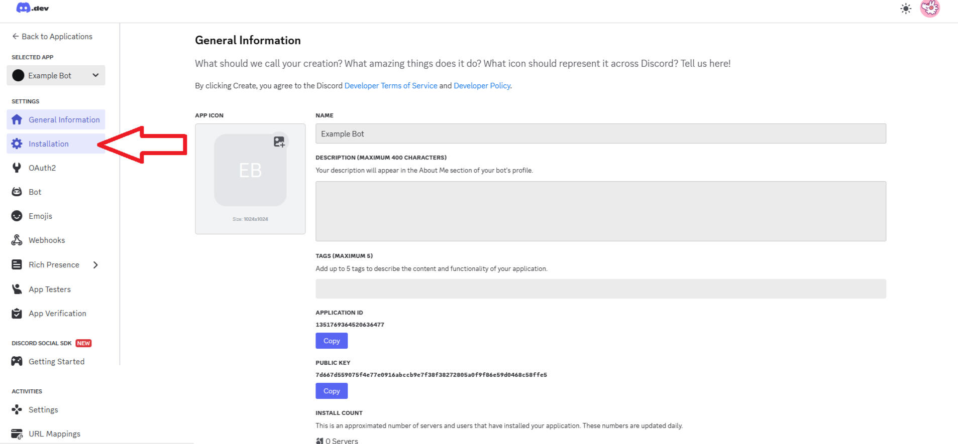 Once you have created the bot, you will land on a page that looks like this. From here you can change the icon and description for the bot. These act like the profile picture and user bios of a regular discord account. First, let's head over to installation on the left side towards the top.