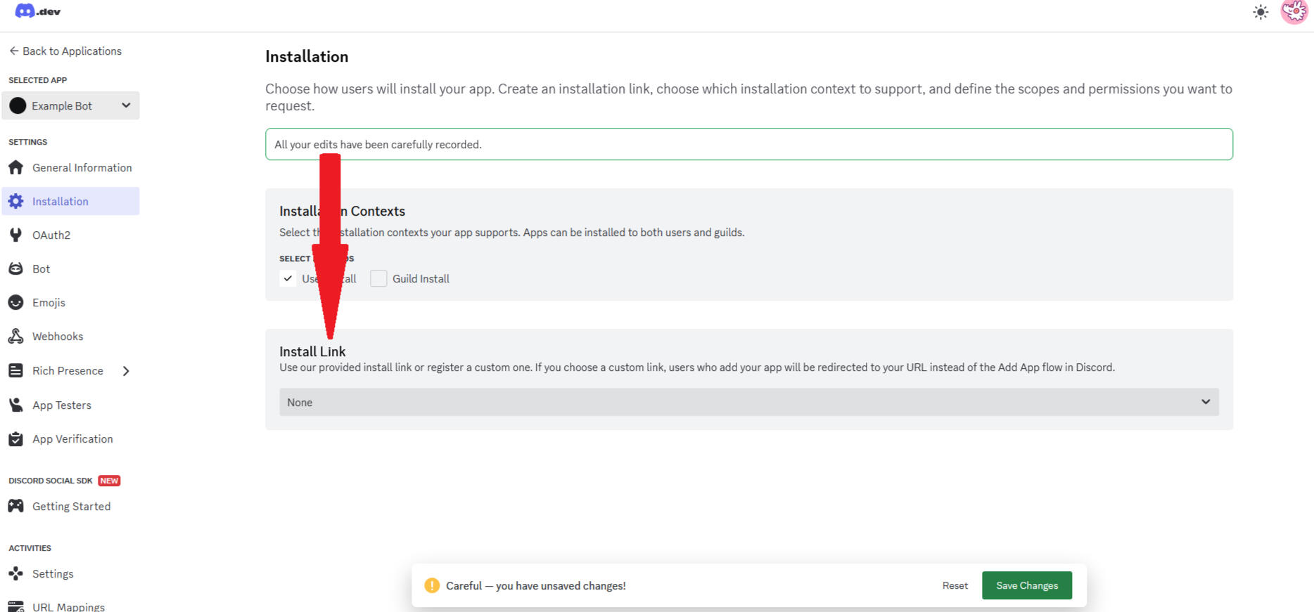 Once you are on the installation page, you will see an install link, copy that and paste it into your browser. Discord will launch a pop up and prompt you to either add to your apps or to a server. You want to add it to your apps. Discord will ask you to authorize it. After that, click the menu under install link and change it to none and uncheck guild install. This is for privacy reasons to prevent people from adding your bot to their profiles. At the bottom, click save changes.