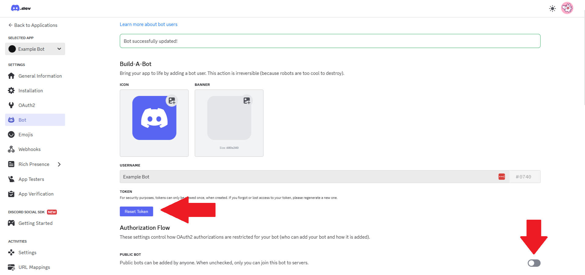 Next, we're going to go to the bot page found on the left side. Here you can customize the app icon, banner, and username. These will show up when you proxy with the bot and can be changed at any time from this webpage. We are going to scroll down a little bit and do two things. First, uncheck "Public Bot". This will prevent other people from adding the bot to their accounts. Hit save changes. Next, go to Token and click "Reset Token", click that you are sure, and then if prompted enter your Multi-Factor Authentication. Once you do, a long string will show up under the token, copy this and keep it somewhere safe where no one else can access it. This is the key to your bot that we will need later in the code section. Do not give it to anyone else or they can get access to the bot and could potentially do something malicious.