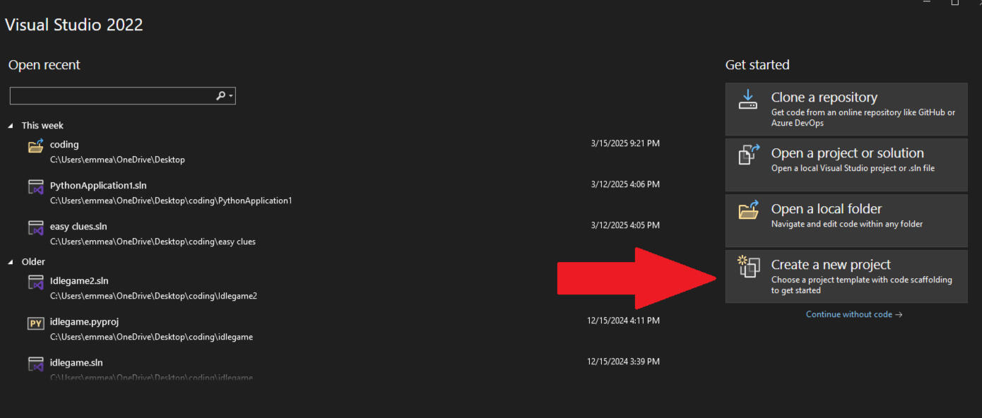 Next, we will be creating a coding environment. For the purposes of this guide, we will be using Visual Studio Community 2022. You can install it from (this link). Download the version appropriate for your operating system. Once downloaded, install it and open it. Click "Create a new project"