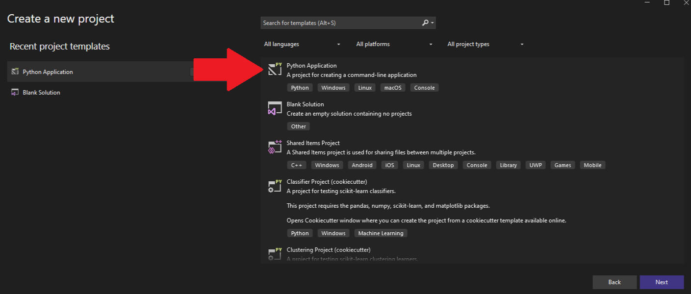 From there, click "Python Application" and then next. Name your project and choose where to save it to. Make it somewhere you will remember.