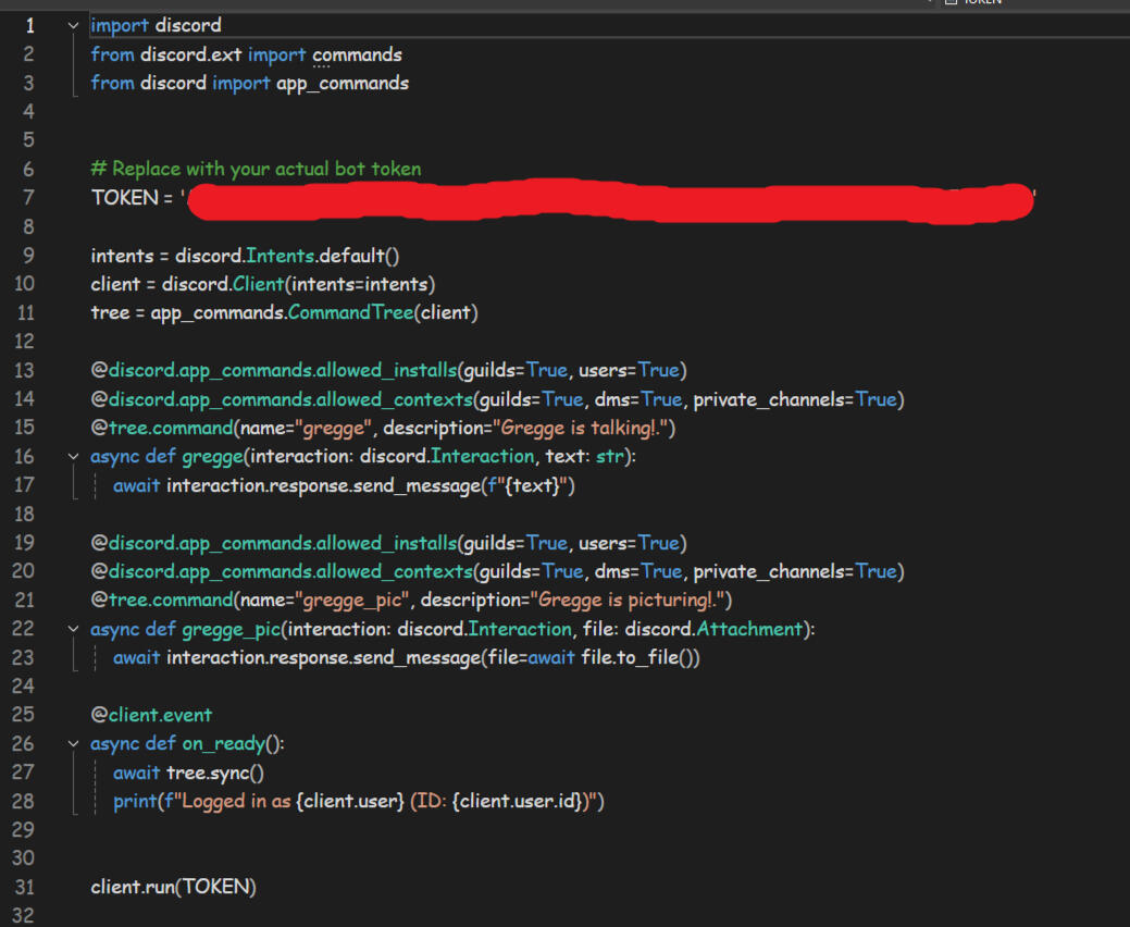 imports: these bring in the discord python library for the botTOKEN: replace this with the token we got earlier when making the discord app. if you've lost it, go back to the discord developer portal and reset the token and copy it from there. Make sure there are quotes around the tokenintents/client/tree: this stuff just primes the bot basically@discord.app_commands.allowed_installs(guilds=True, users=True)